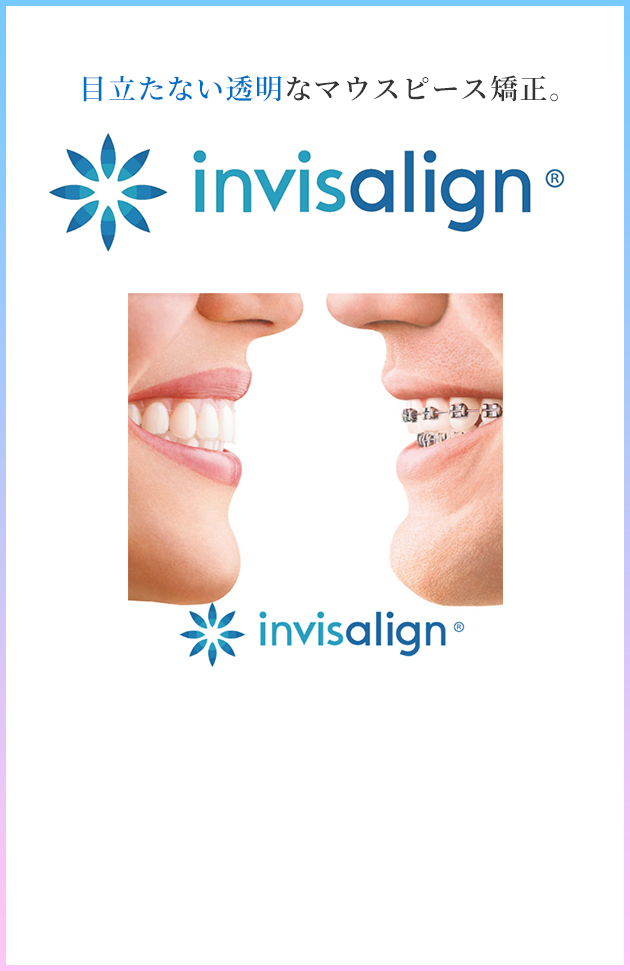 インビザラインで美しい口元に 歯並びが悪くて恥ずかしい 矯正したいけど今からでも間に合うの? 矯正したいけどワイヤーをつけたくない。矯正したいけど人目が気になる…そんなお悩みがある方にインビザラインがおすすめ!