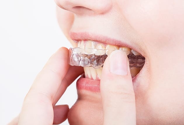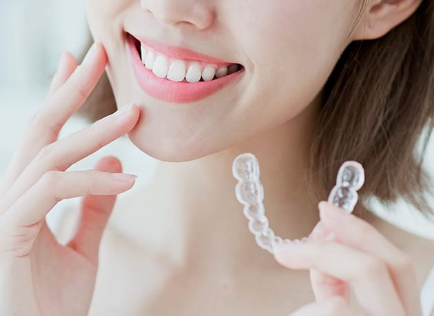 患者さま専用に作製された矯正装置(アライナー)を装着します。 取り外しが可能なアライナーの着脱方法やお手入れ方法、注意事項などを歯科医師が患者さまに説明します。アライナーは、装置の種類によって違いますが、1日に装着する時間が決まっています。指定された時間装着しながら、治療の段階に合わせて新しいものにつけ替えていきます。